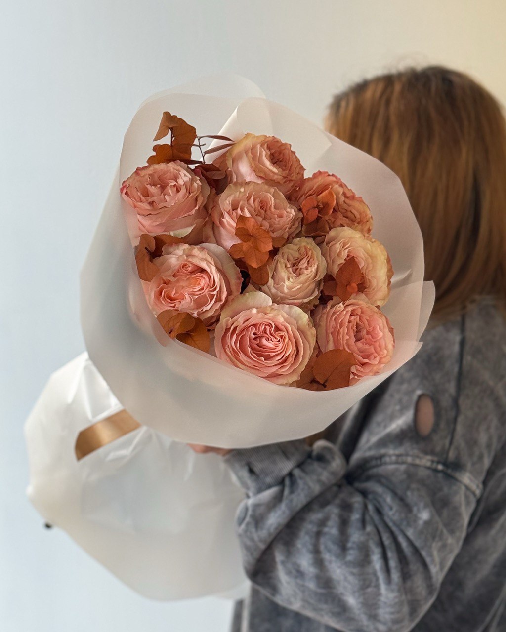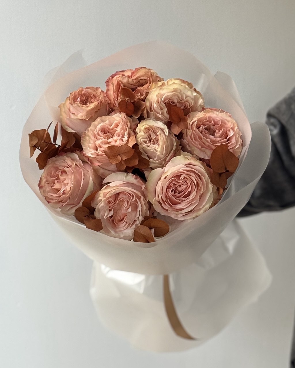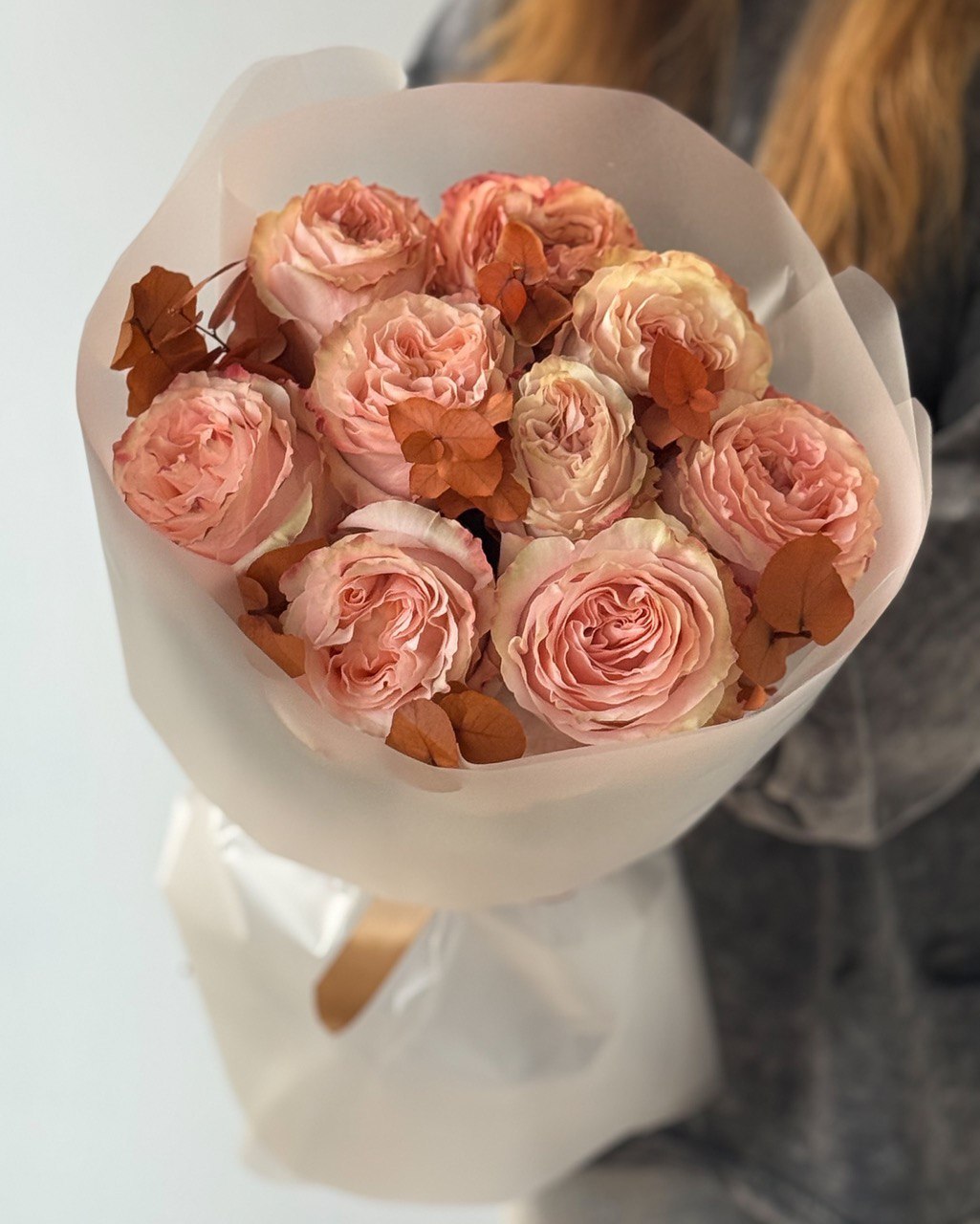 Осенний букет с крупными пионовидными розами сорта Princess Crown кремово-персикового оттенка со стабилизированным пыльно-оранжевым эвкалиптом ❤️