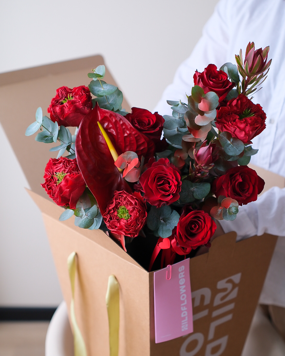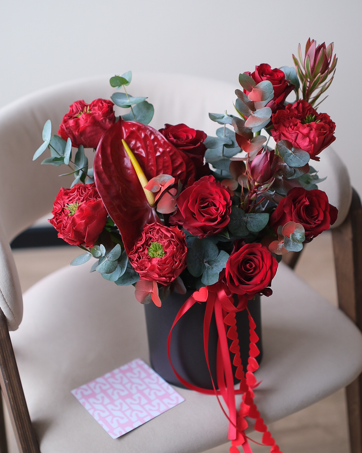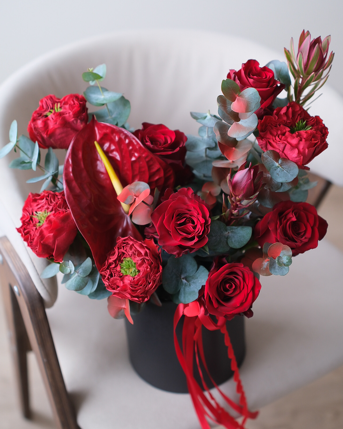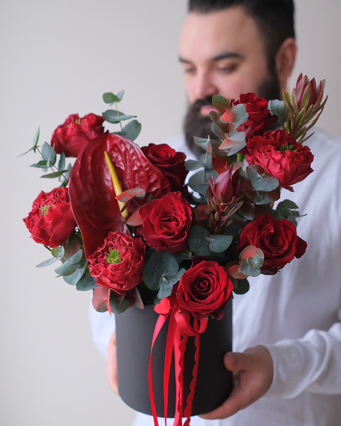 Пионовидная роза Ред Монстр - 4 шт., роза Эксплорер - 4 шт., антруиум - 1 шт., леукодендрон - 2 шт., эвкалипт - 2 шт., шляпная коробка - 1 шт., инструкция и средство по уходу за цветами, транспортировочная коробка