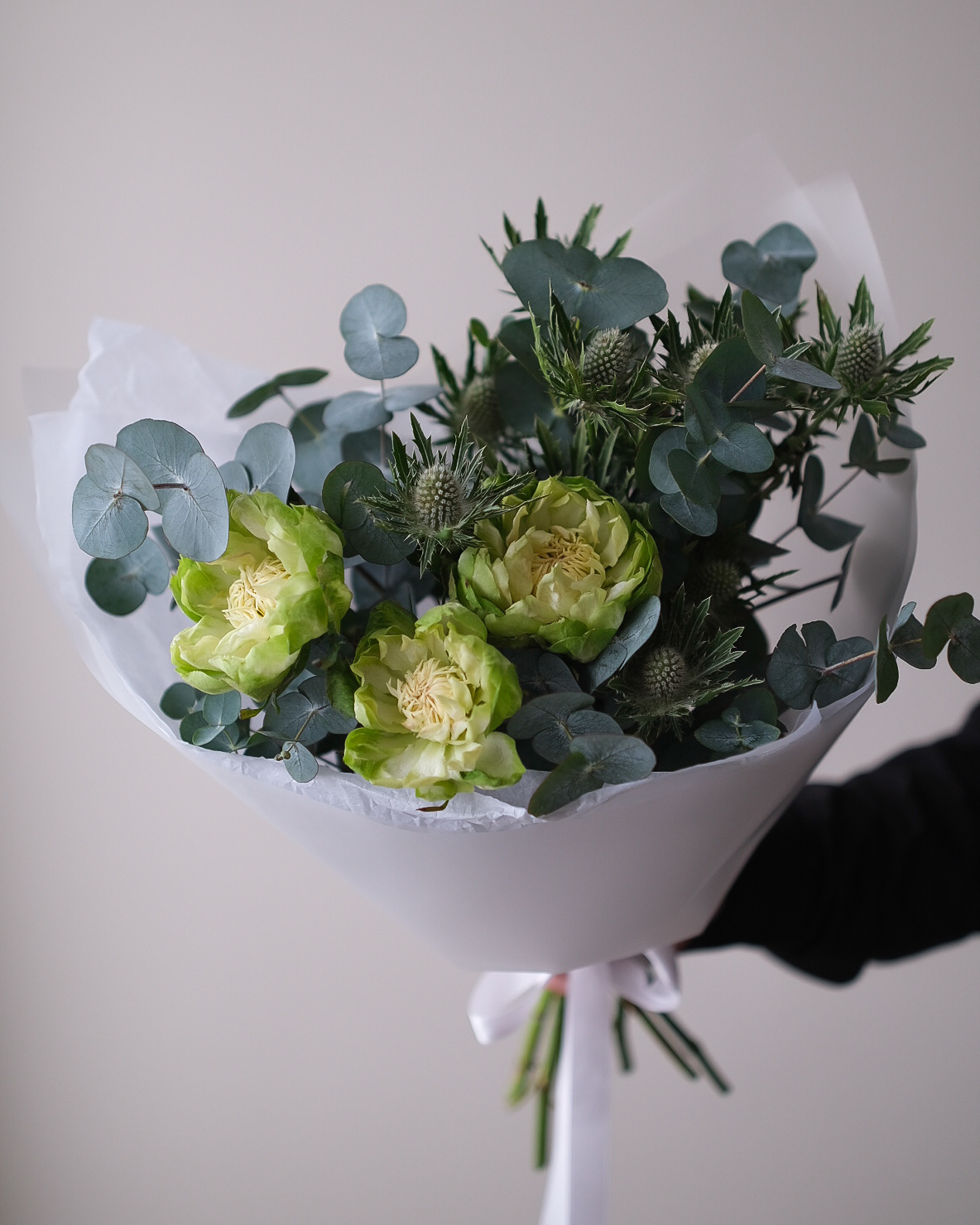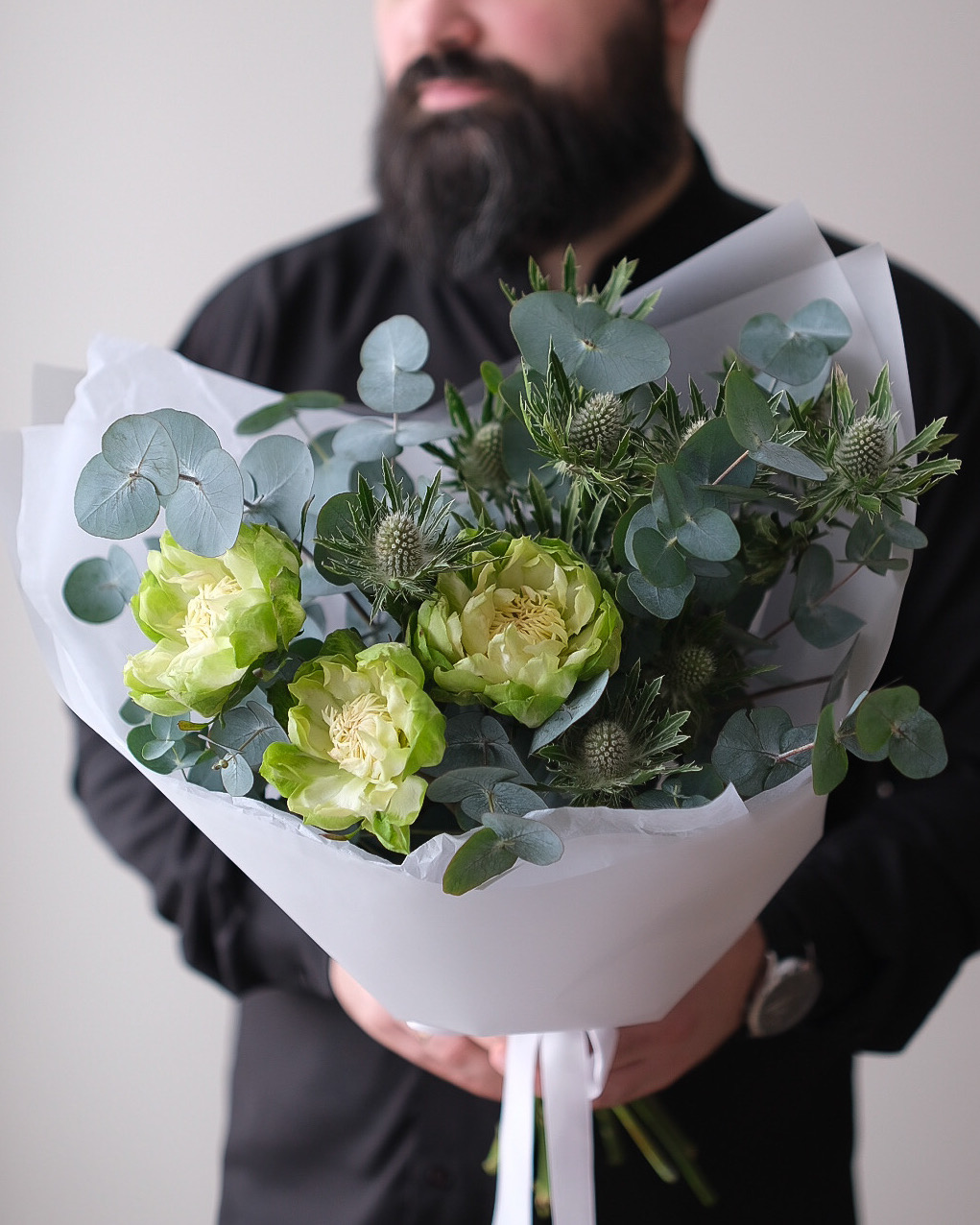 Фактурный букет с эрингиумом и пионовидными розами Вегги сочного зеленого цвета 💚