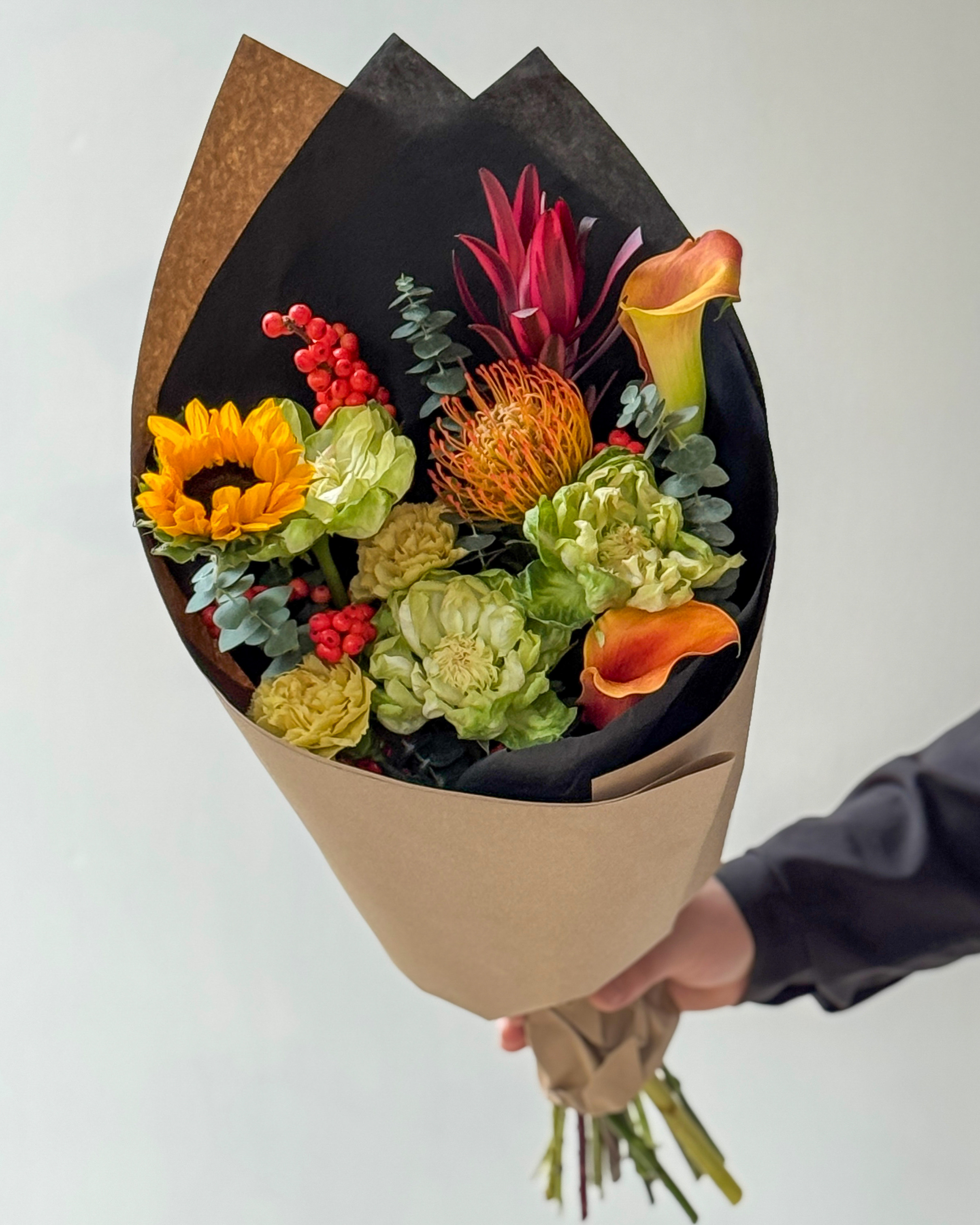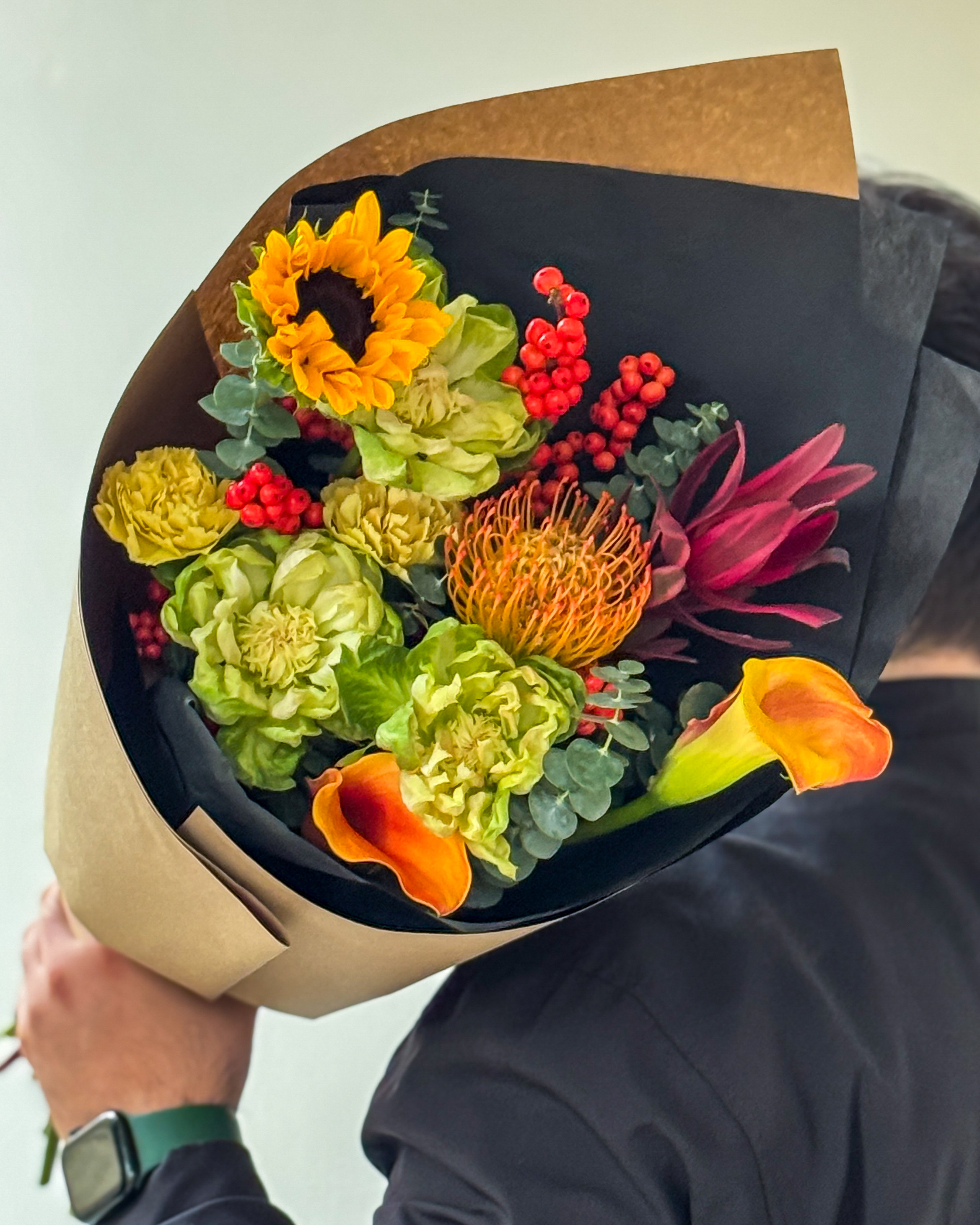 Илекс - 1 шт. Калла - 2 шт. Эвкалипт - 1 шт. Подсолнух - 1 шт. Нутан - 1 шт. Сафари - 1 шт. Диантус ледж марон - 2 шт. Пионовидная роза вегги - 3 шт.