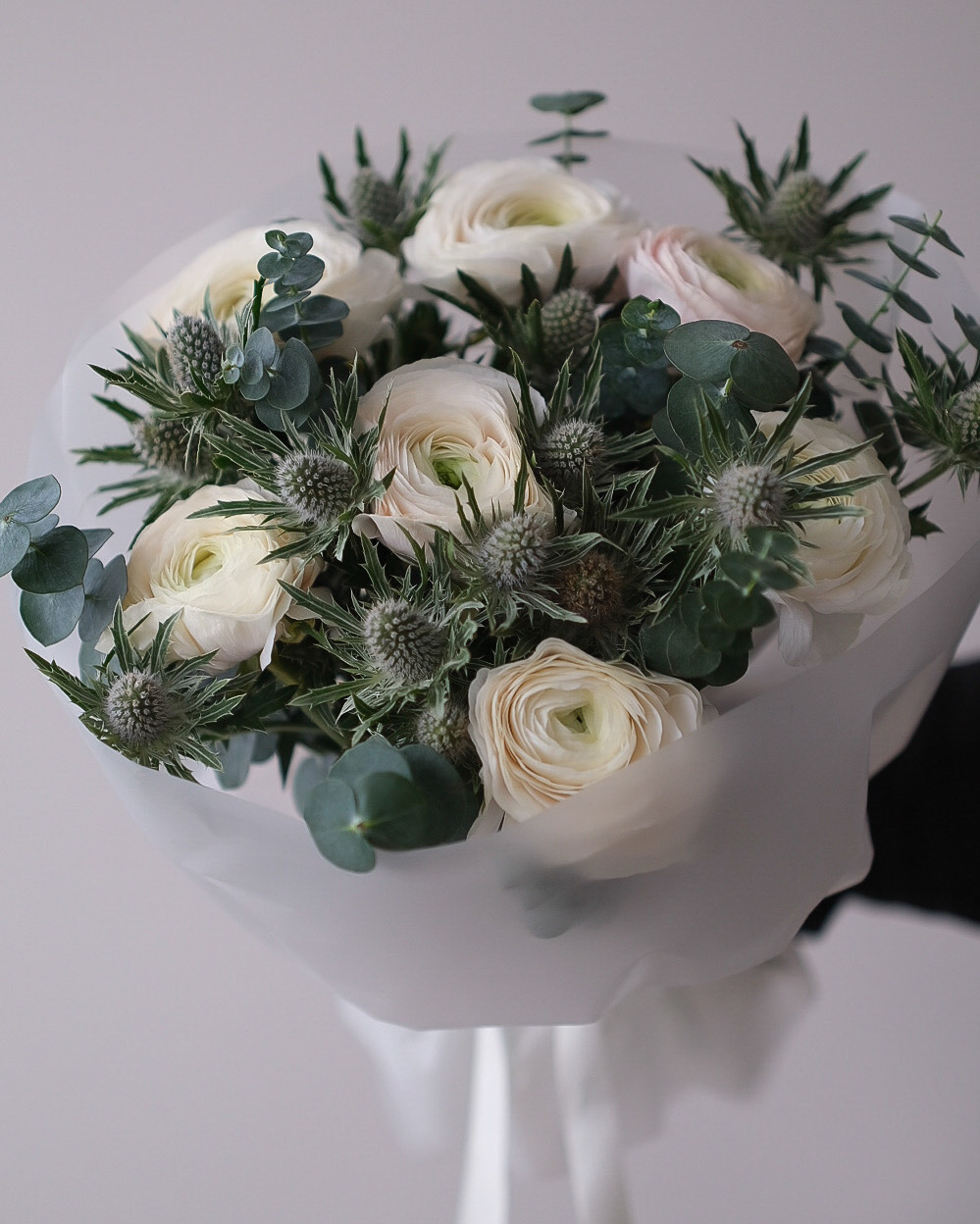 Букет с ранункулюсами, фактурным эрингиумом и эвкалиптом. Стильный, минималистичный, только цветы и любовь 💚