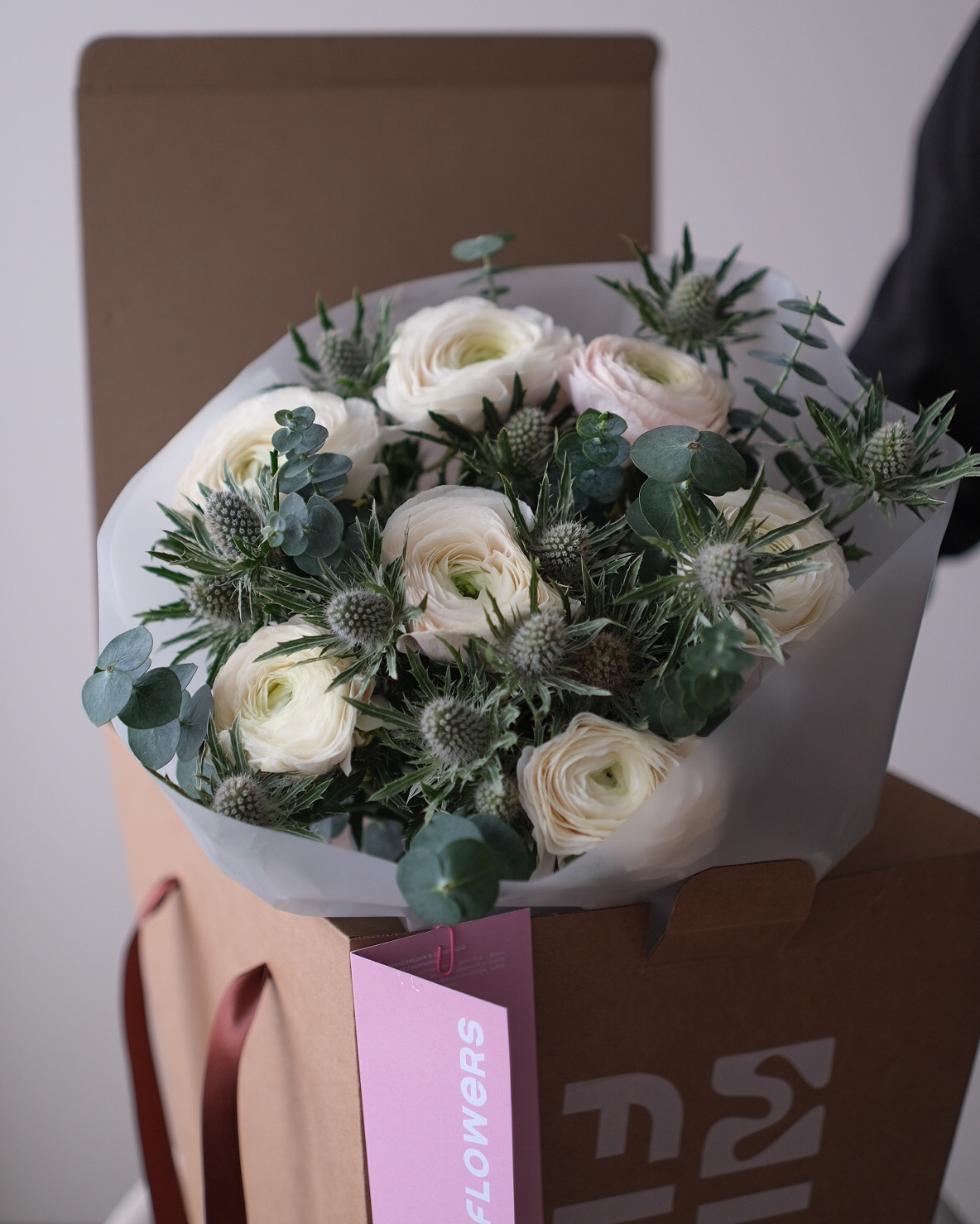Ранункулус - 7 шт. Эрингиум - 4 шт. Эвкалипт - 2 шт. Упаковка - 1 шт. Транспортировочная коробка - 1 шт. Инструкция по уходу - 1 шт. Подкормка для стойкости цветов - 1 шт.