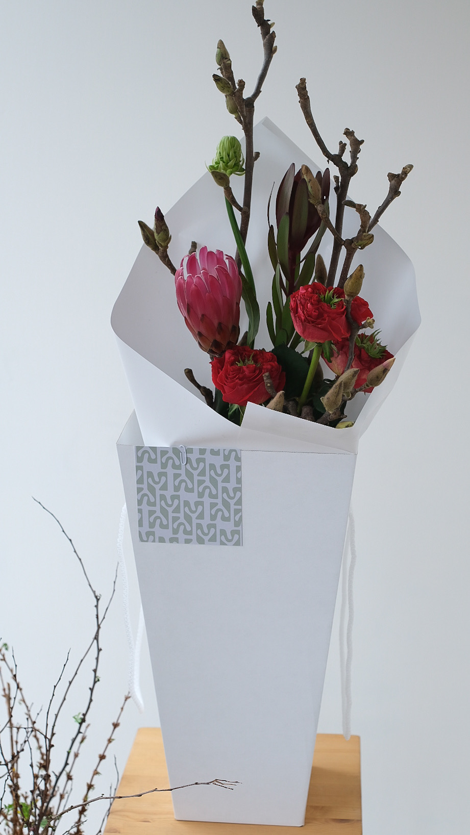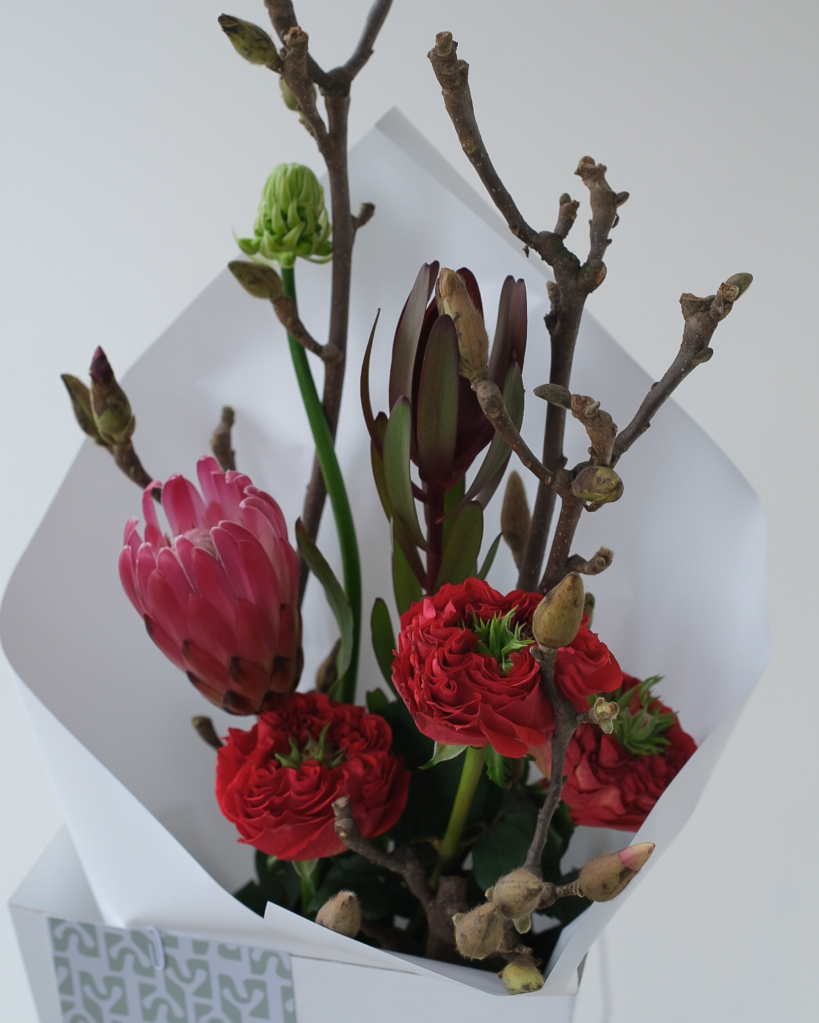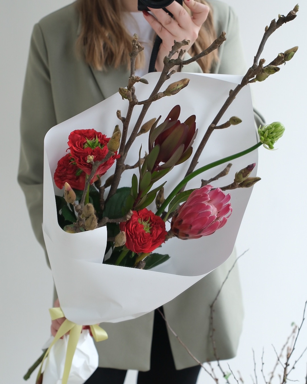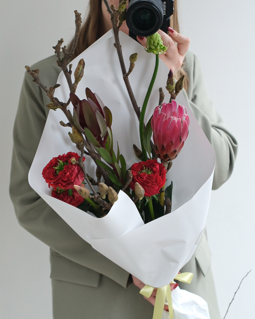 Букет с ветками магнолии, протеей и пионовидными розами Ред Монстр