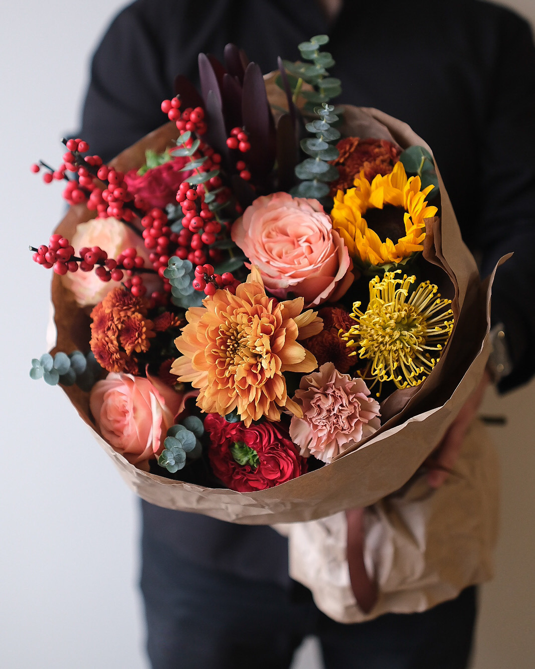 Илекс - 1 шт. Хризантема Сантини - 3 шт. Эвкалипт - 2 шт. Подсолнух - 1 шт. Сафари - 1 шт. Пионовидная роза кахала - 2 шт. Хризантема салмон - 1 шт. Пионовидная роза ред монстр - 2 шт. Диантус ледж марон - 1 шт. Пионовидная роза принцесс краун - 1 шт.