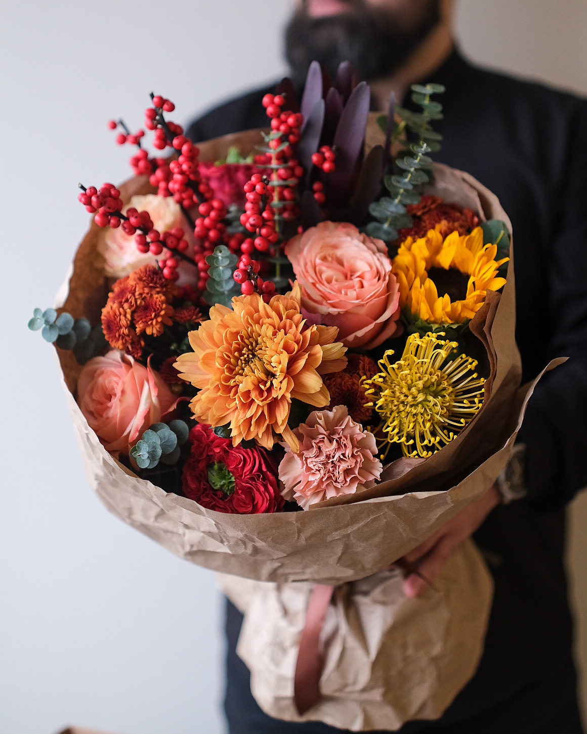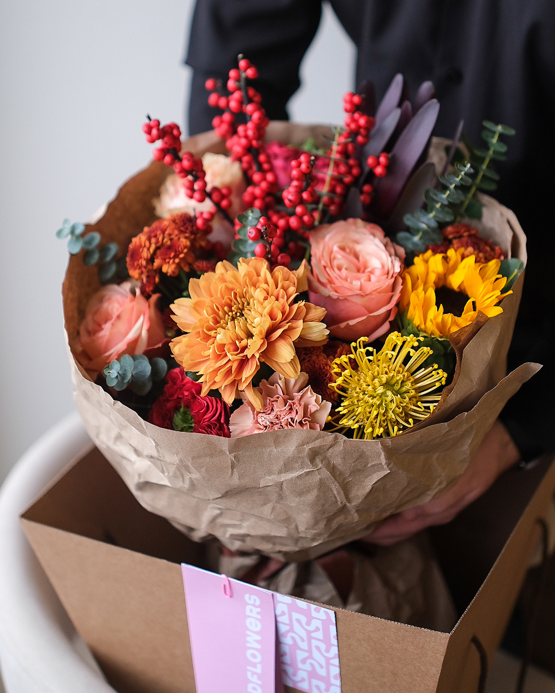 Яркий букет с подсолнухом, хризантемами, нутаном и ягодным илексом в крафте❤️