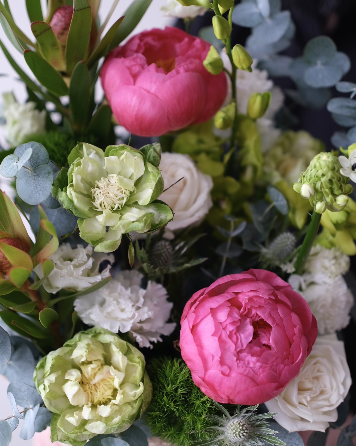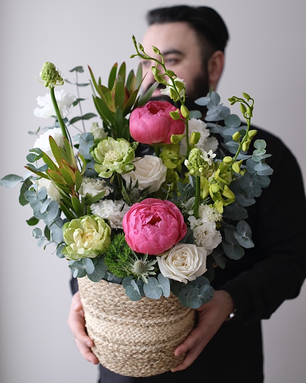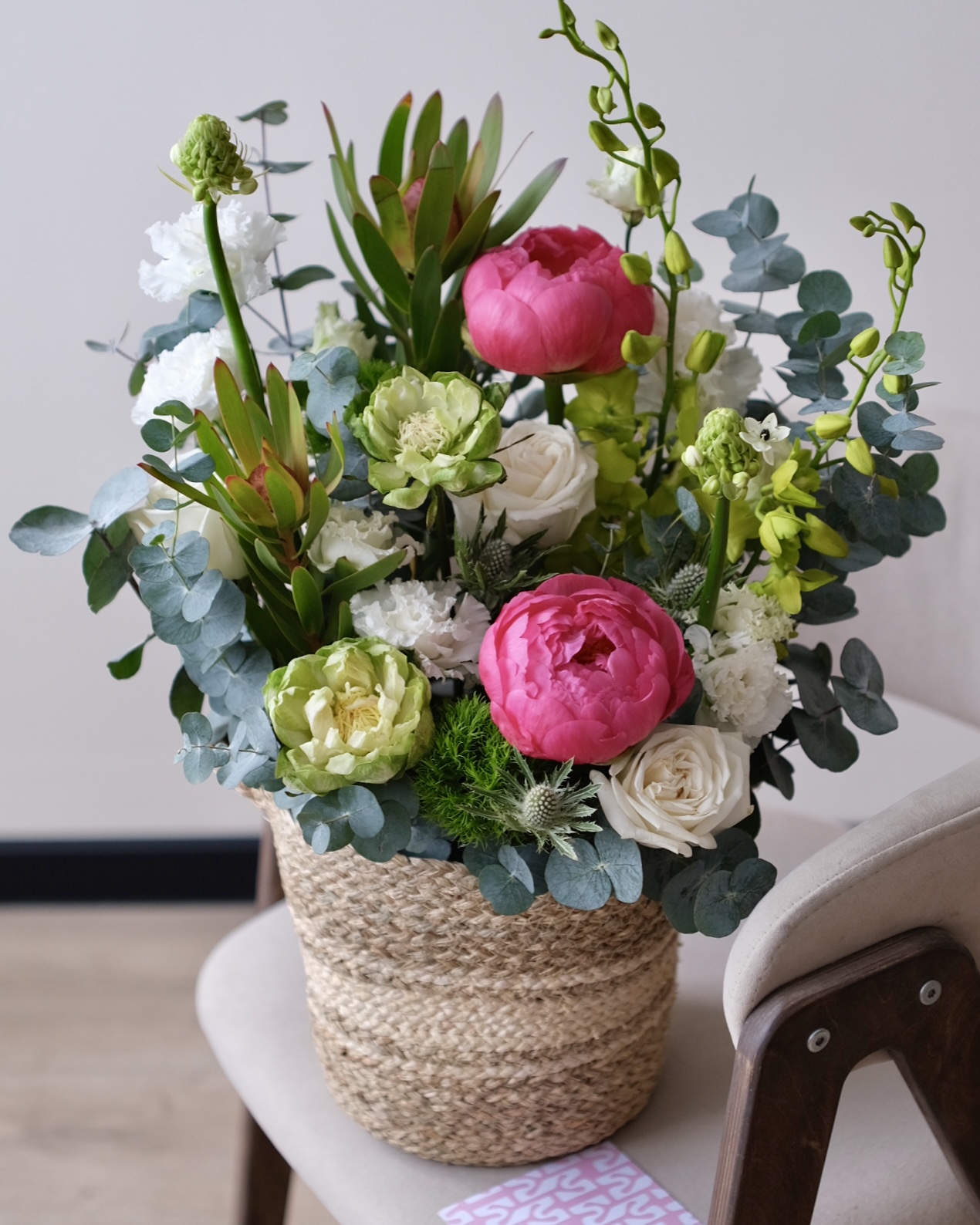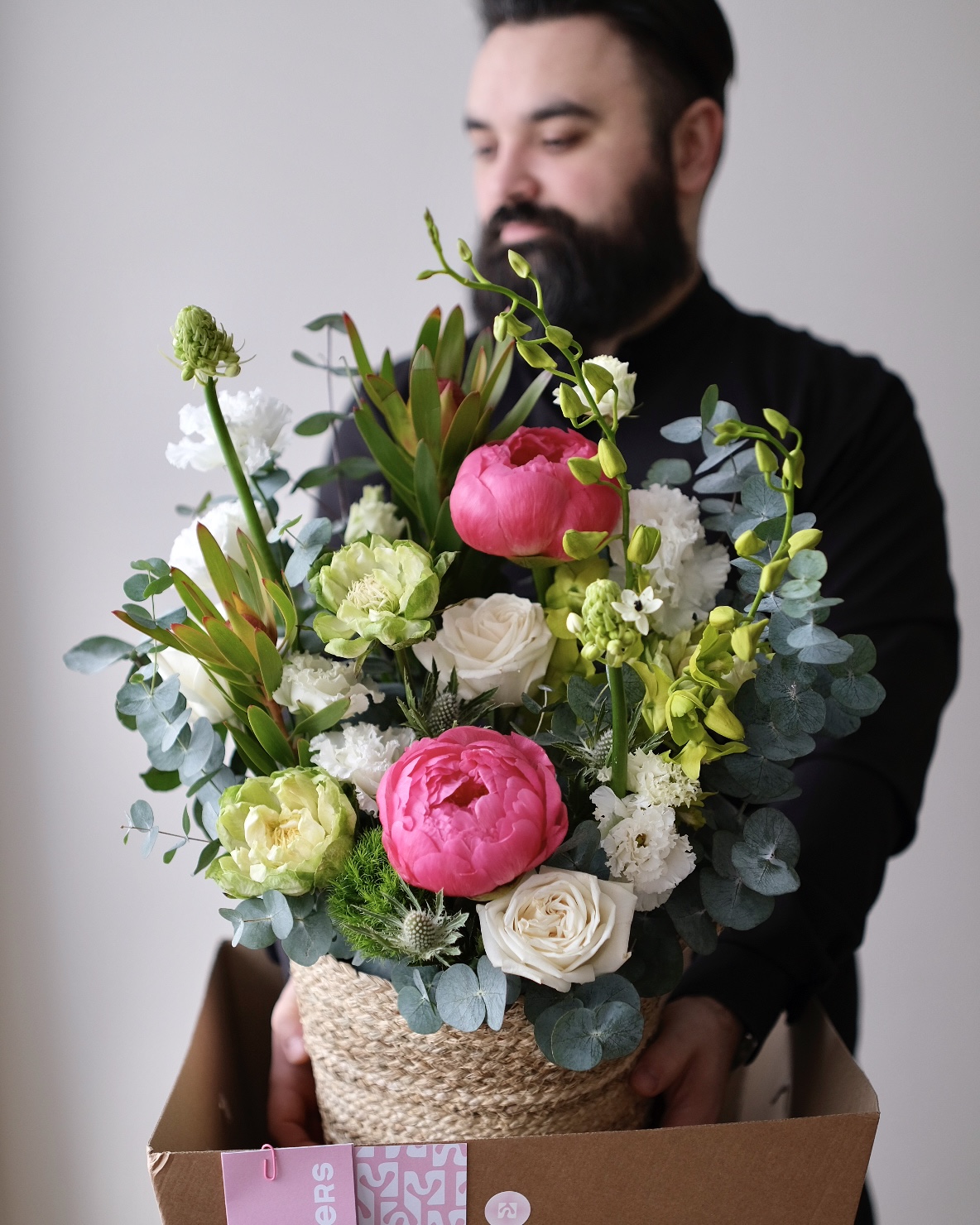 Орхидея Дендробиум - 3 шт. Эвкалипт - 3 шт. Эрингиум - 1 шт. Орнитогалум - 2 шт. Лизиантус Алиса Белый - 4 шт. Роза плая бланка - 3 шт. Диантус грин трикс - 1 шт. Пионовидная роза вегги - 2 шт. Пион корал шарм - 2 шт. Леукодендрон - 2 шт. Плетеная корзина - 1 шт. Транспортировочная коробка - 1 шт. Инструкция по уходу - 1 шт. подкормка для стойкости цветов - 1 шт.