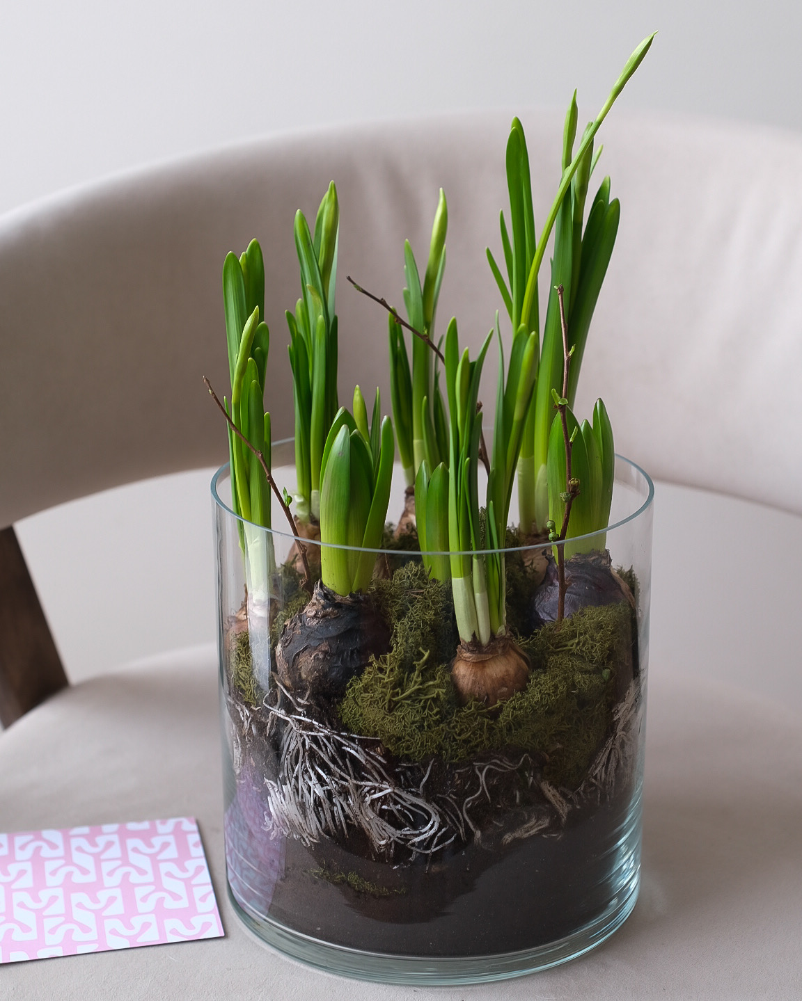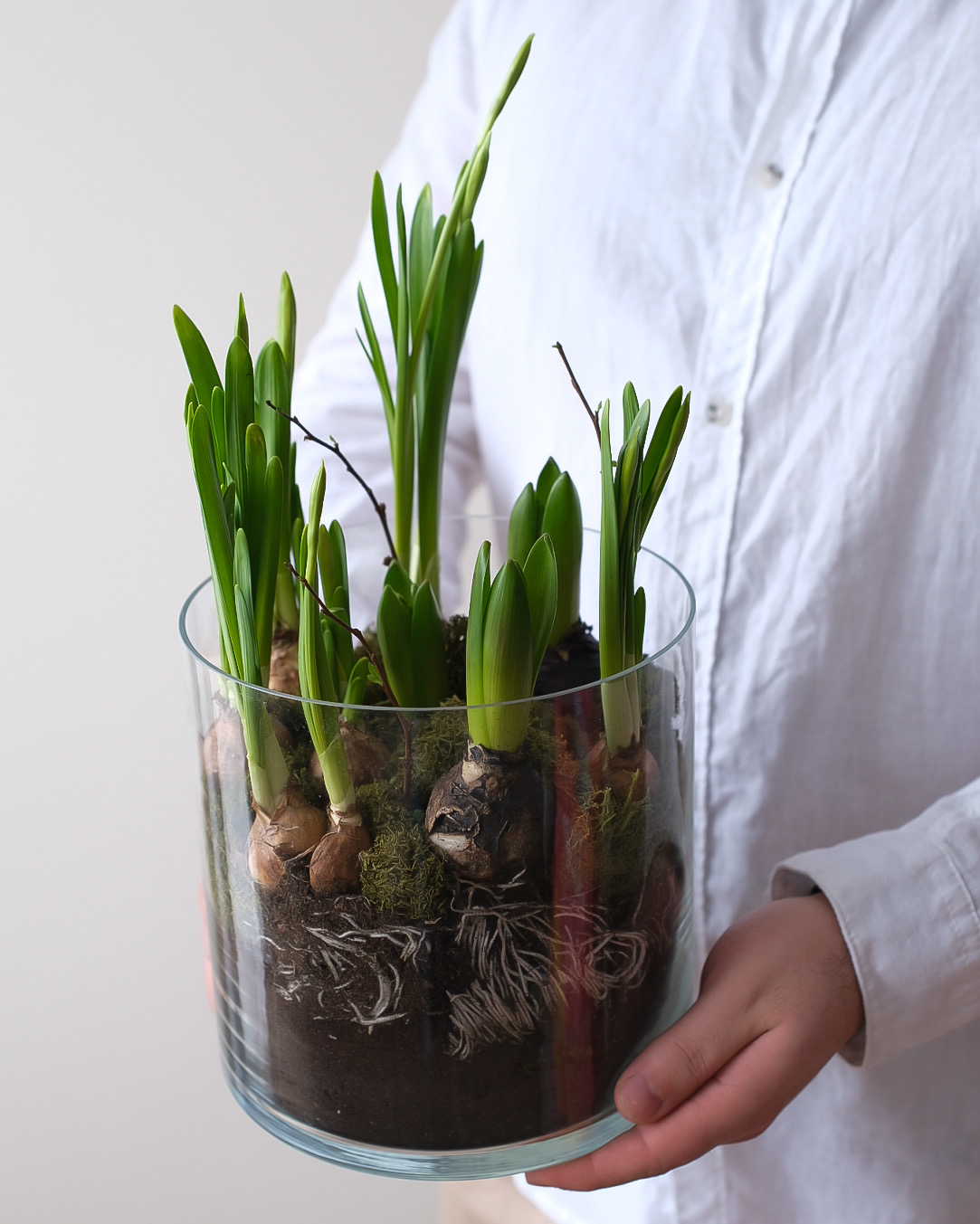 Композиция из нежных первоцветов в луковицах в прозрачной стеклянной вазе — стильный акцент для дома, офиса или в подарок. Сквозь стекло видны натуральные слои мха и почвы, а также сама луковица — это придаёт композиции природную эстетику и ощущение весны в интерьере. Луковичные растения (гиацинты, мини-нарциссы) постепенно раскрываются, радуя сочной зеленью и цветением. Композиция компактная, аккуратная и не требует сложного ухода.
