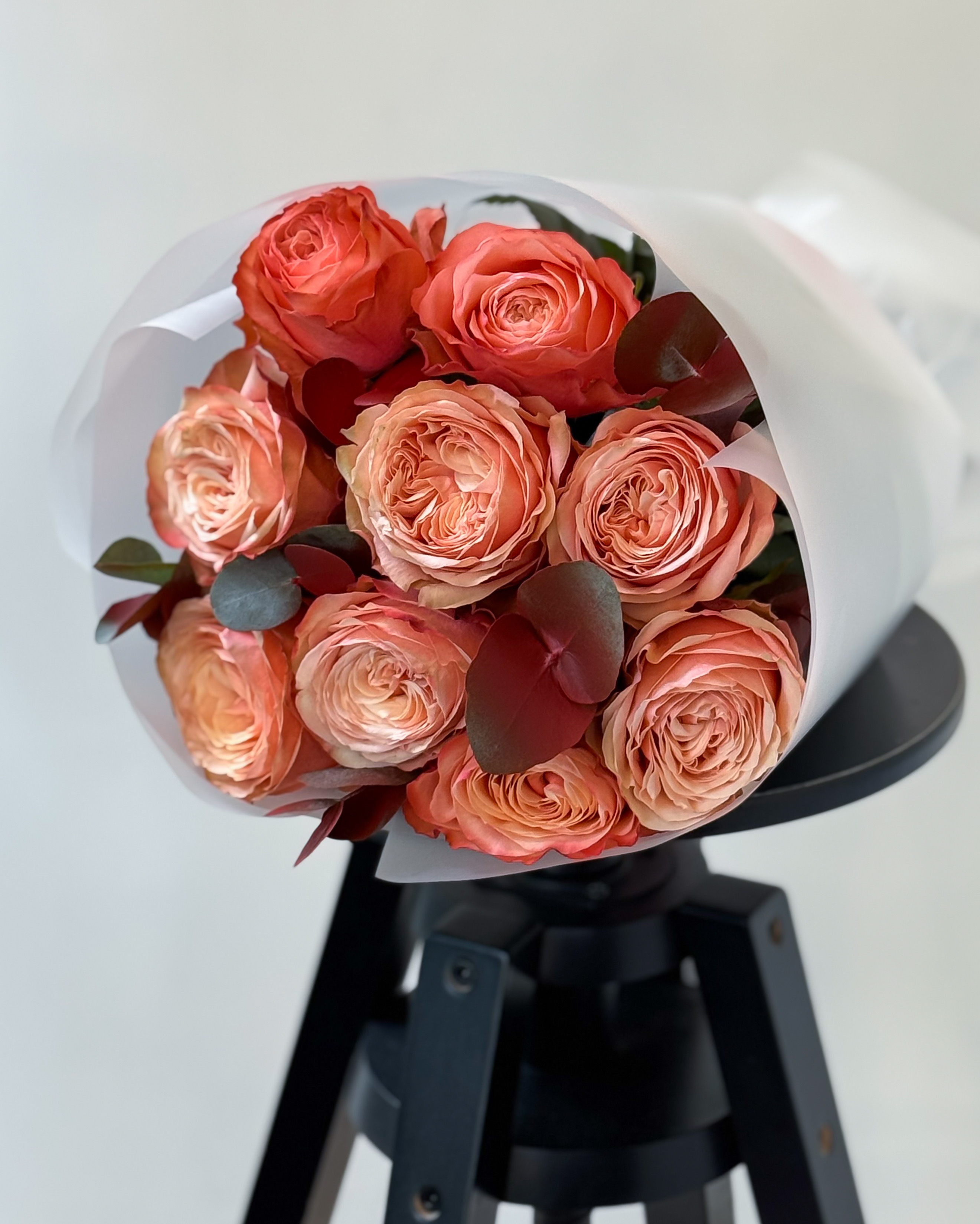 Стильный монобукет из эквадорских роз Kahala в теплых осенних тонах: персиковый, оранжевый, бордовый