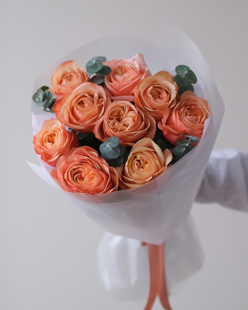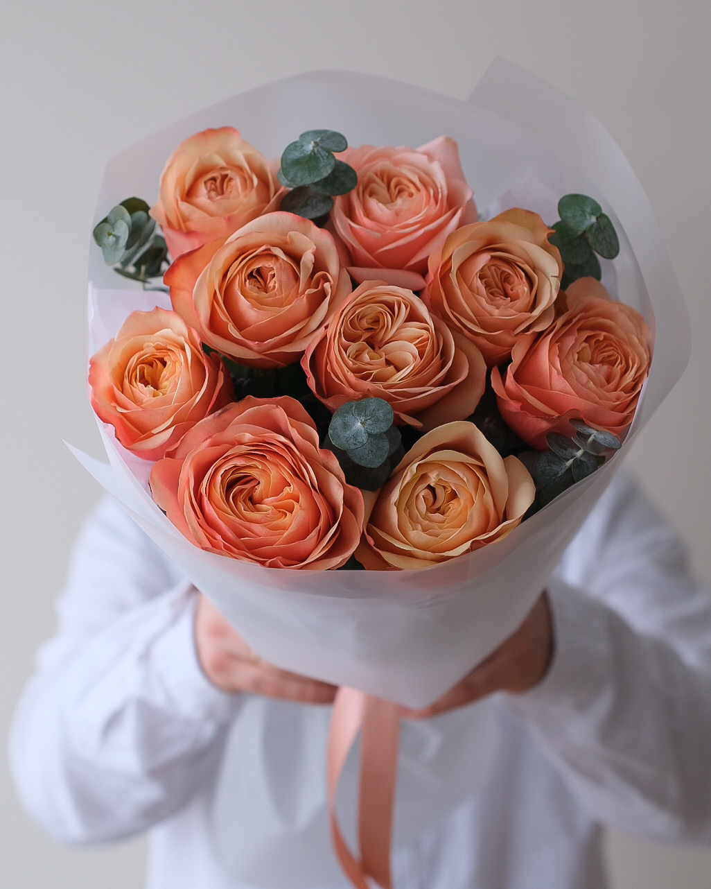 Букет из персиковых эквадорских роз сорта Кахала с пудровым эвкалиптом 🧡 Цветы и упаковка, которая не отвлекает от букета. Ничего лишнего 🫶🏻