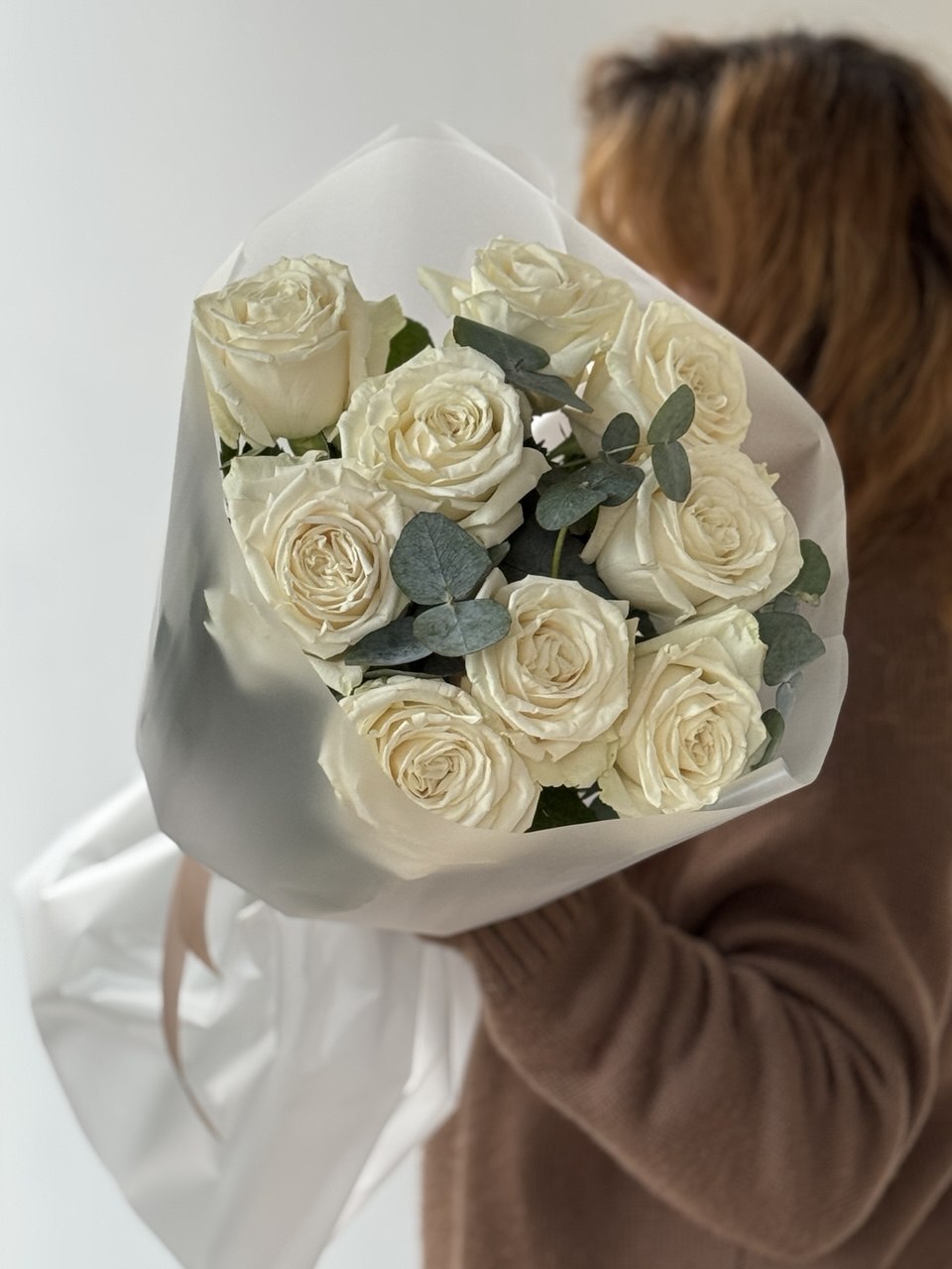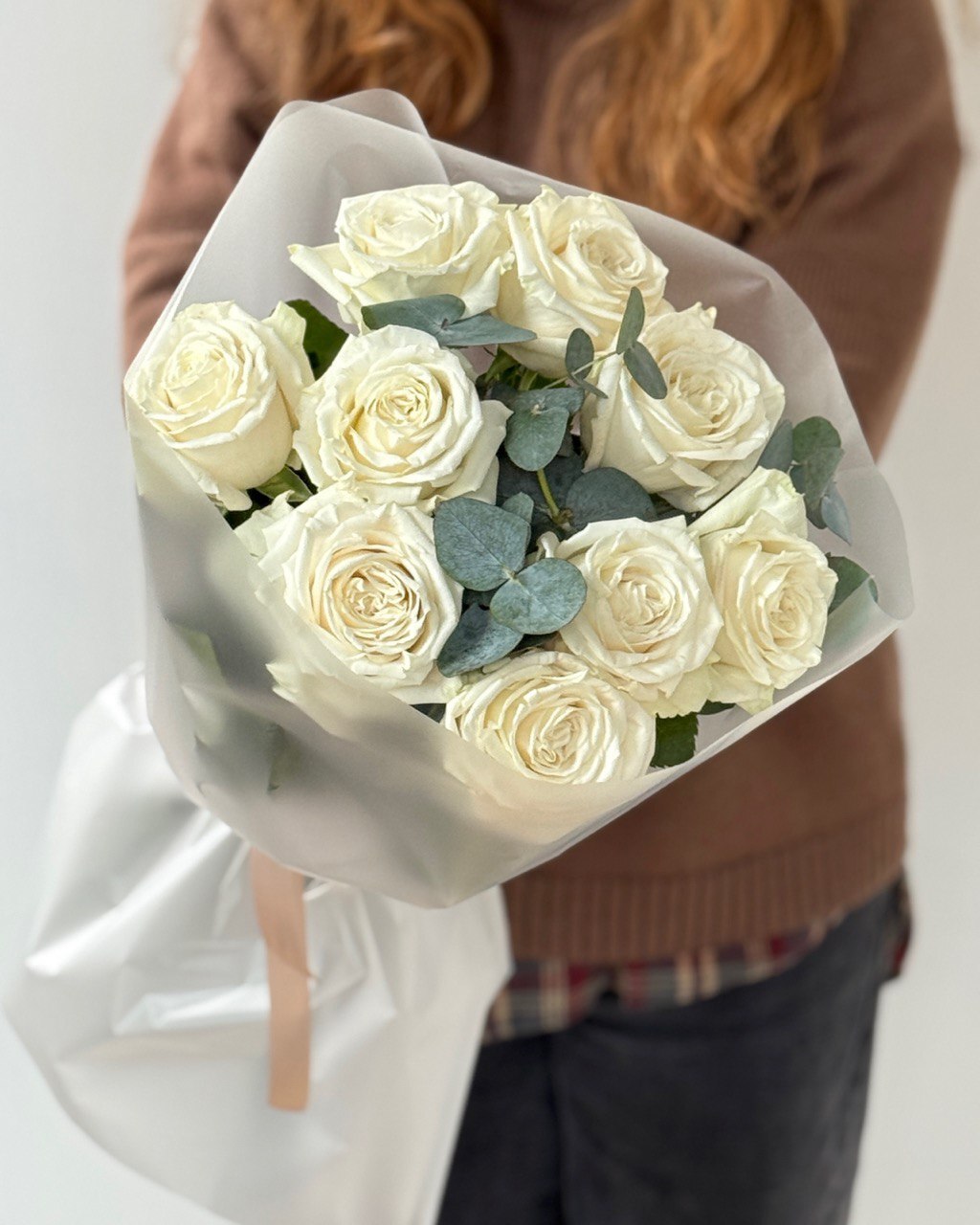 Стильный монобукет из белых садовых роз Плая Бланка с веточками пудрового эвкалипта 🌿 Идеальный вариант для: