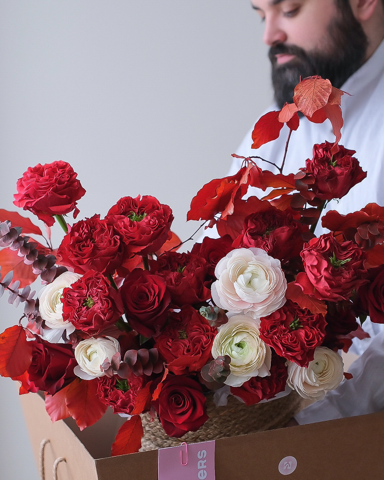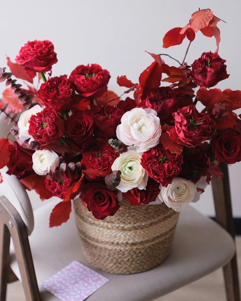 Эффектная композиция в плетёной корзине с пионовидными и классическими розами, ранункулюсами, эвкалиптом и декоративной листвой. Глубокие красные и молочные оттенки создают эффектный, статусный образ — идеальный выбор для 14 февраля, дня рождения, юбилея или выразительного подарка с характером.