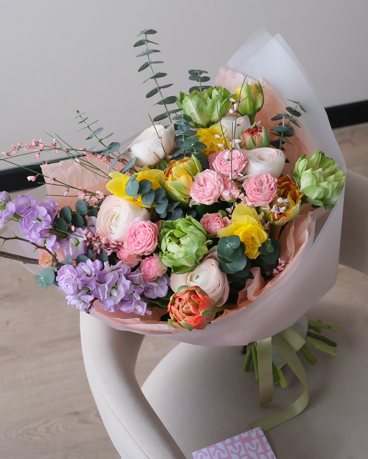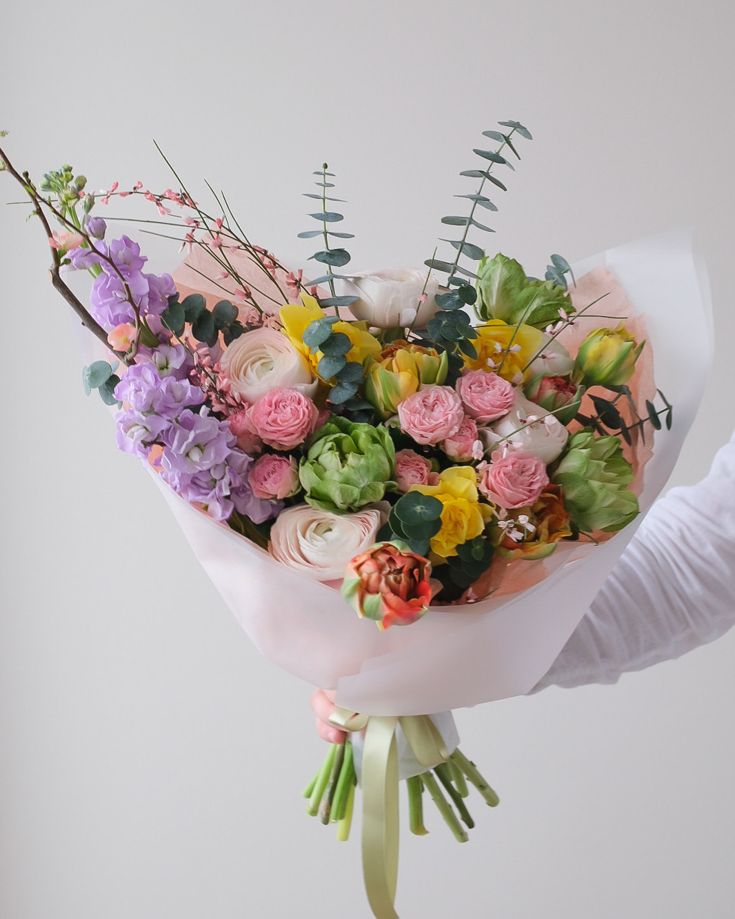 Маттиола - 2 шт. Нарцисс - 3 шт. Эвкалипт - 1 шт. Кустовая пионовидная роза - 2 шт. Гениста - 1 шт. Ветка сливы - 1 шт. Роза вегги - 3 шт. Ранункулус - 5 шт. Тюльпан дабл гудошник - 5 шт. Упаковка - 1 шт. Транспортировочная коробка - 1 шт. Инструкция по уходу - 1 шт. Подкормка для срезанных цветов - 1 шт.