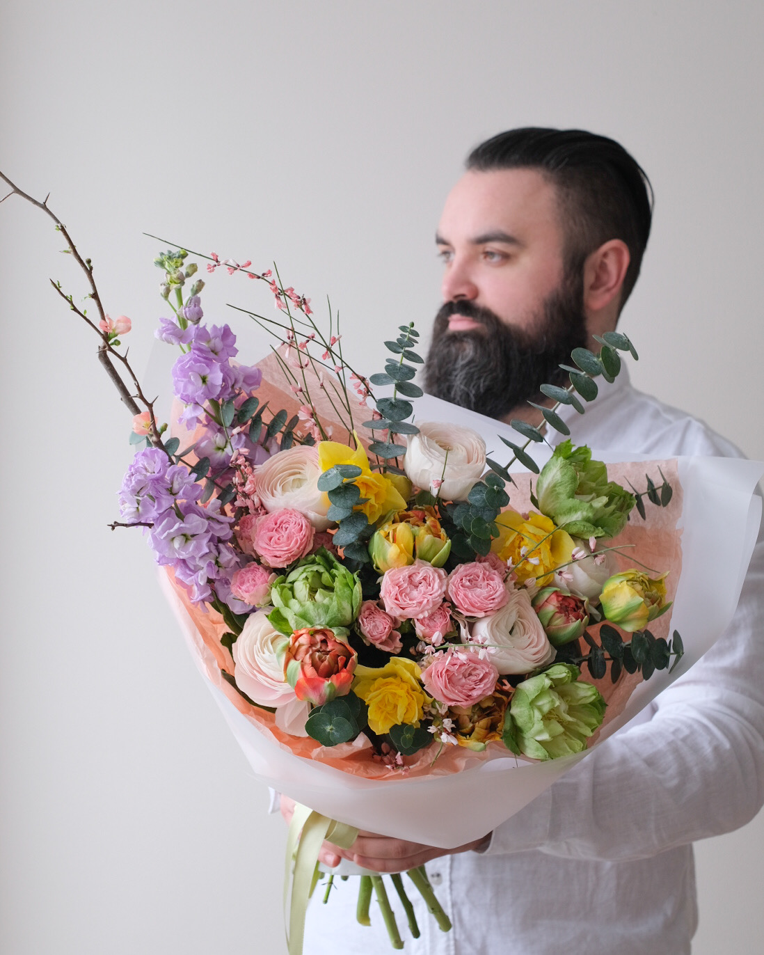 Букет с ветками сливы, ранункулюсами, тюльпанами Double Gudoshnik и нарциссами с весенним настроением 🌱☀️